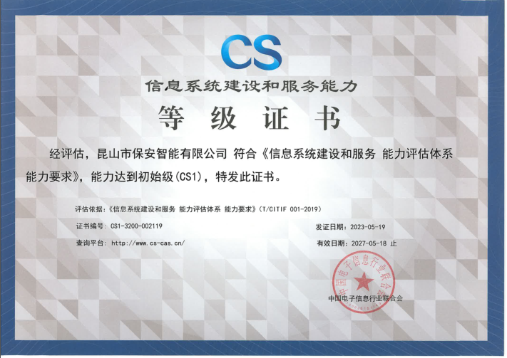 喜報(bào)!保安智能公司成功取得信息系統(tǒng)建設(shè)和服務(wù)能力CS1證書